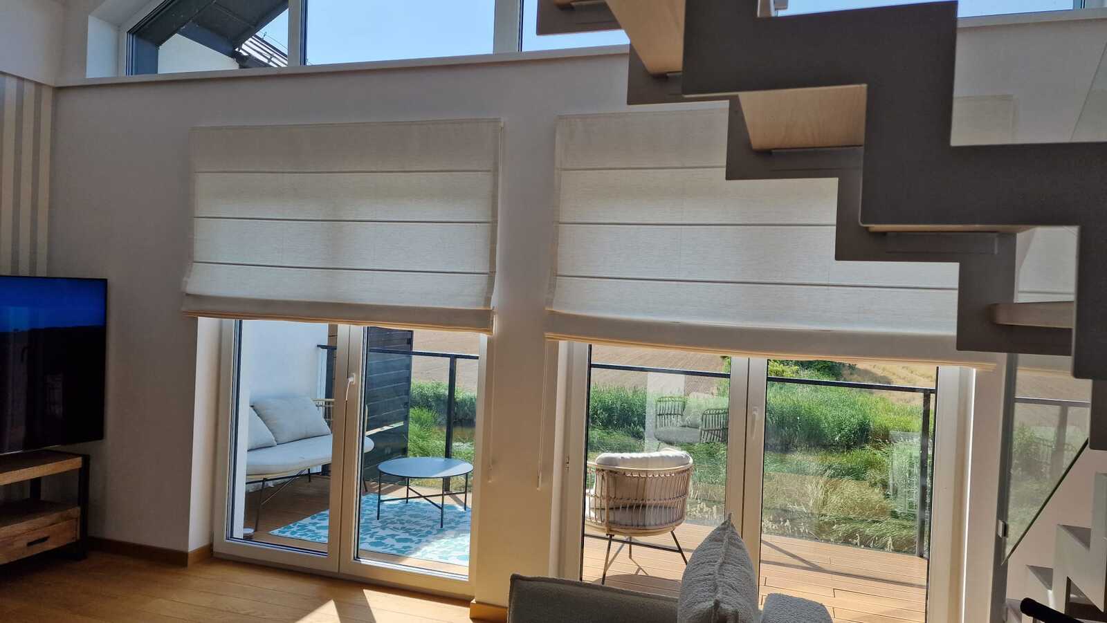 Szyte na miarę z ozdobnych tkanin pełnią funkcję dekoracyjną okna i nadają niepowtarzalny wygląd wnętrzom w których są zastosowane. Sterowane mechanizmem łańcuszkowym umożliwiają regulowanie wysokości upięcia tkaniny, jednocześnie ograniczając przedostawanie się promieni słonecznych. Zasłony Rzymskie są ważnym elementem w wystroju wnętrza. Można je wykonać z cienkiej przezroczystej tkaniny, jak również tkaniny zasłonowej a nawet zaciemniającej. Nadają się do montażu zarówno na suficie, ścianie jak i ramie okna. Łatwe w utrzymaniu czystości.